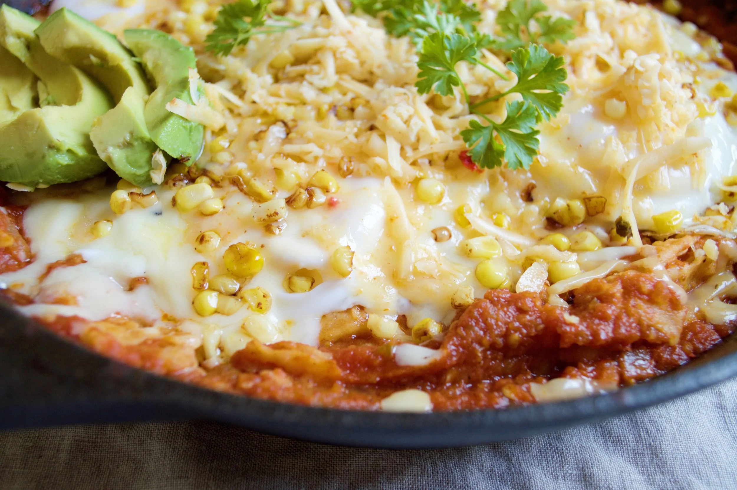 add in tortilla chips and stir to coat. Let simmer for a few minutes. Form 6 wells in the sauce and tortilla mixture and crack an egg into each well. Cover with lid and let simmer until egg whites are firm. Top with shredded cheese, avocado, and corn sauteed in olive oil and garlic.
